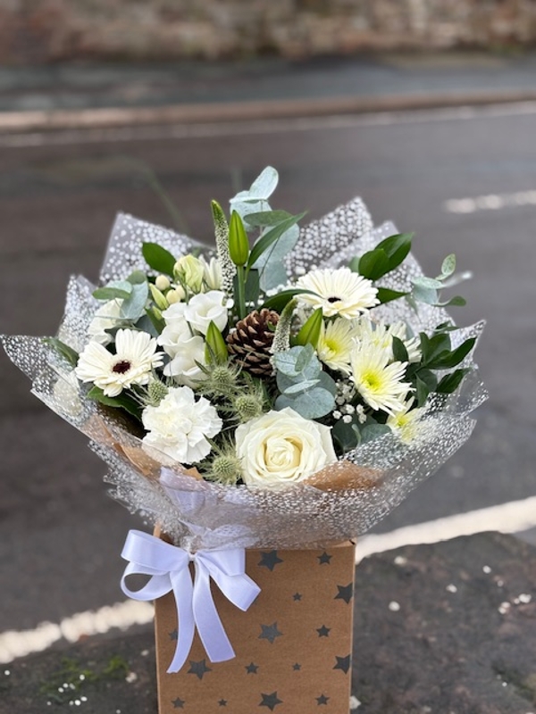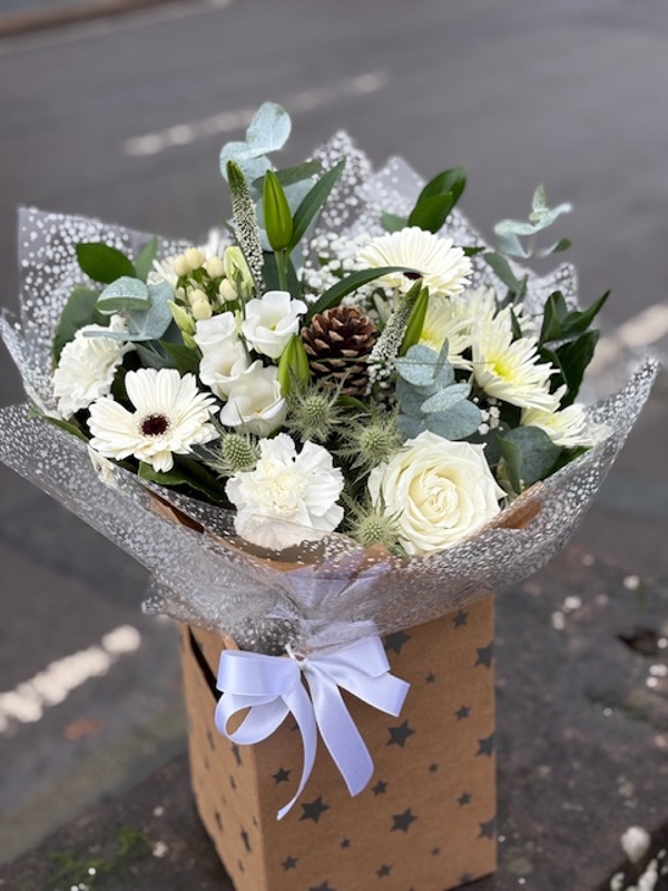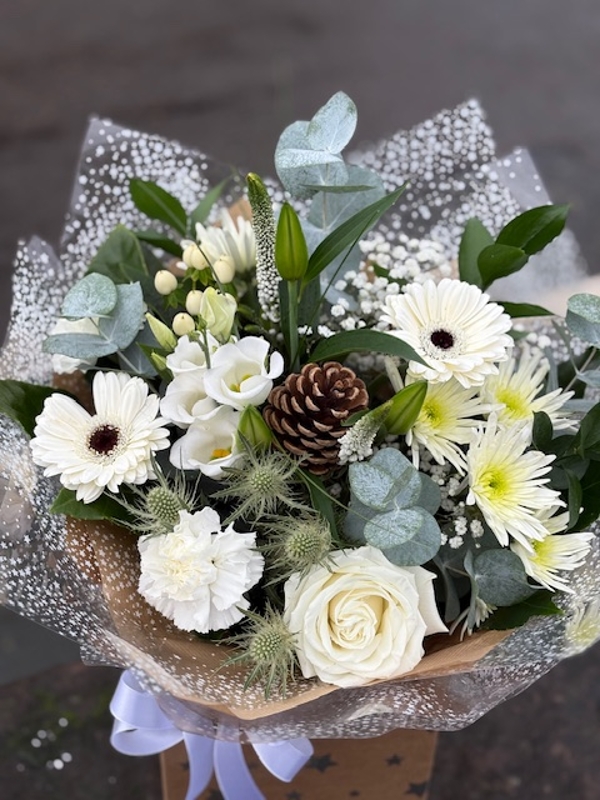 Luxury feel of a white Christmas With lush eucalyptus, Lilly, Veronica, white berries, lisianthus, white thistle, gypsophila, rose, gerberas. A Perfect gift for Christmas