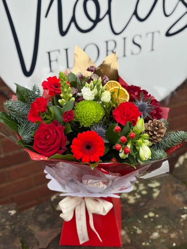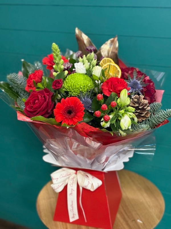 Traditional Christmas Bouquet in water in Red , gold, white and green with festive oranges and pinecones. Make someone's wish come true this Christmas