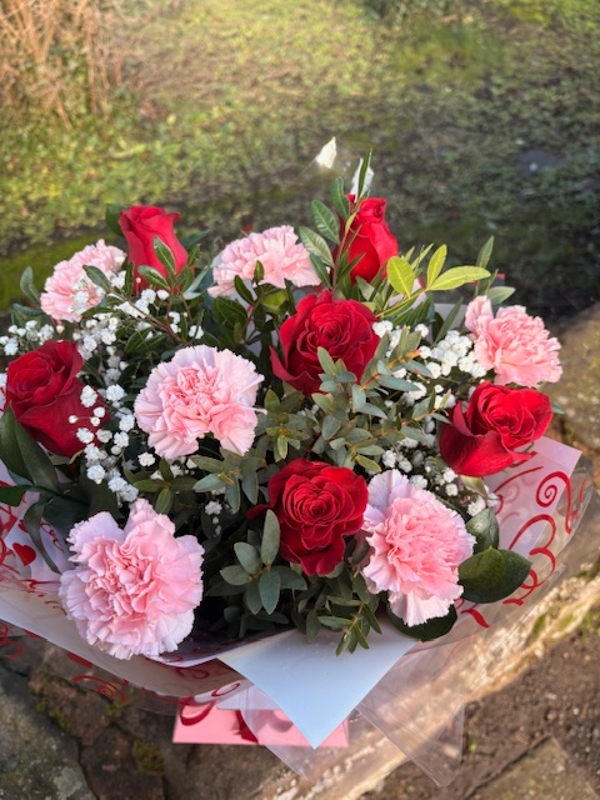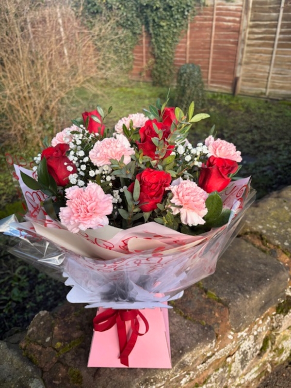 6 red roses and 6 pink carnations with Gypsophila and foliage in Aqwa box