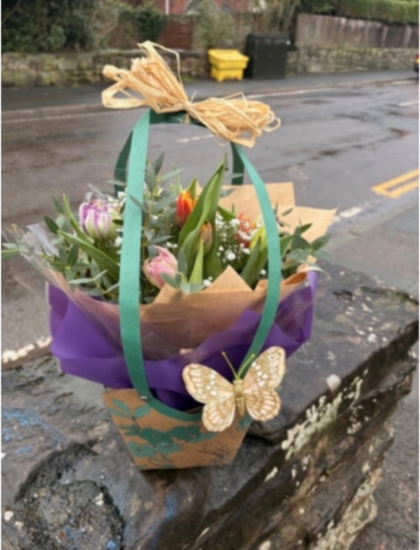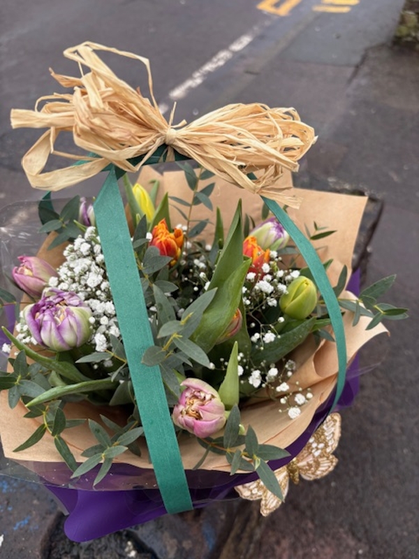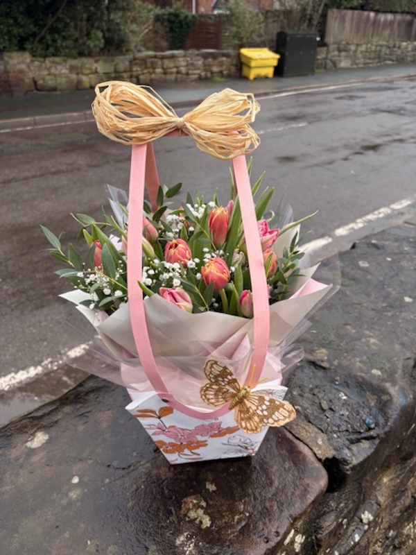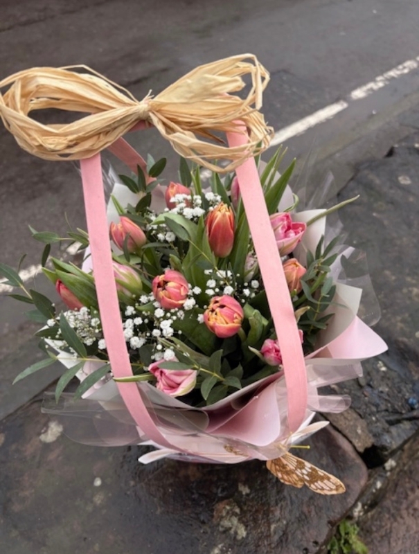Tulips in a luxury bag, set in water, with gypsophila and foliage